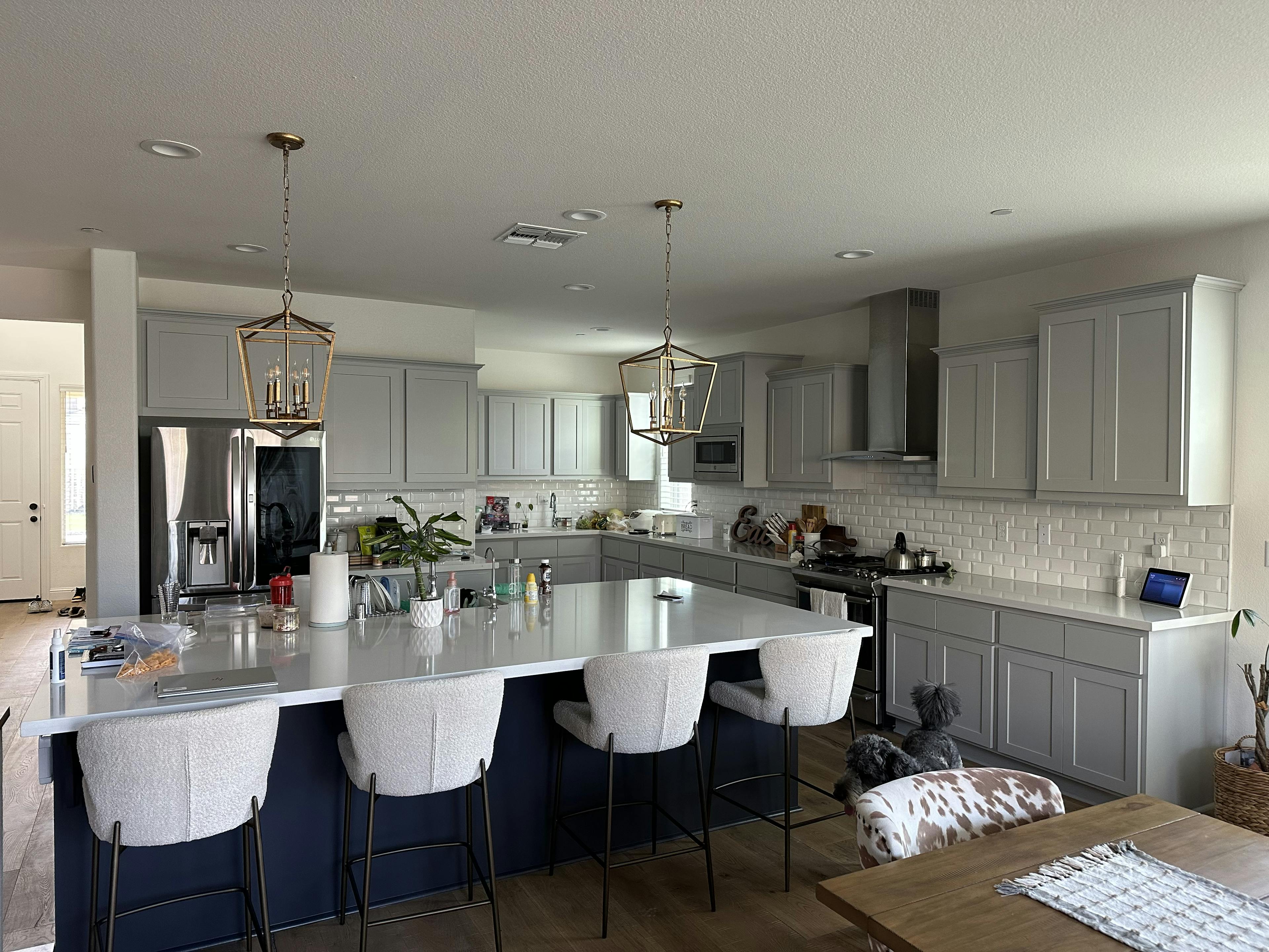A recently completed project for a homeowner in Rancho Cordova, CA. Previously everything was one uniform color. The homeowner wanted their island painted a deep dark blue color, so we went with After Midnight. For the kitchen cabinets and drawers we went with a lighter color, San Fran. Fog. This nice color contrast really brought out the kitchen cabinets, and gave the entire kitchen a fresh new look.