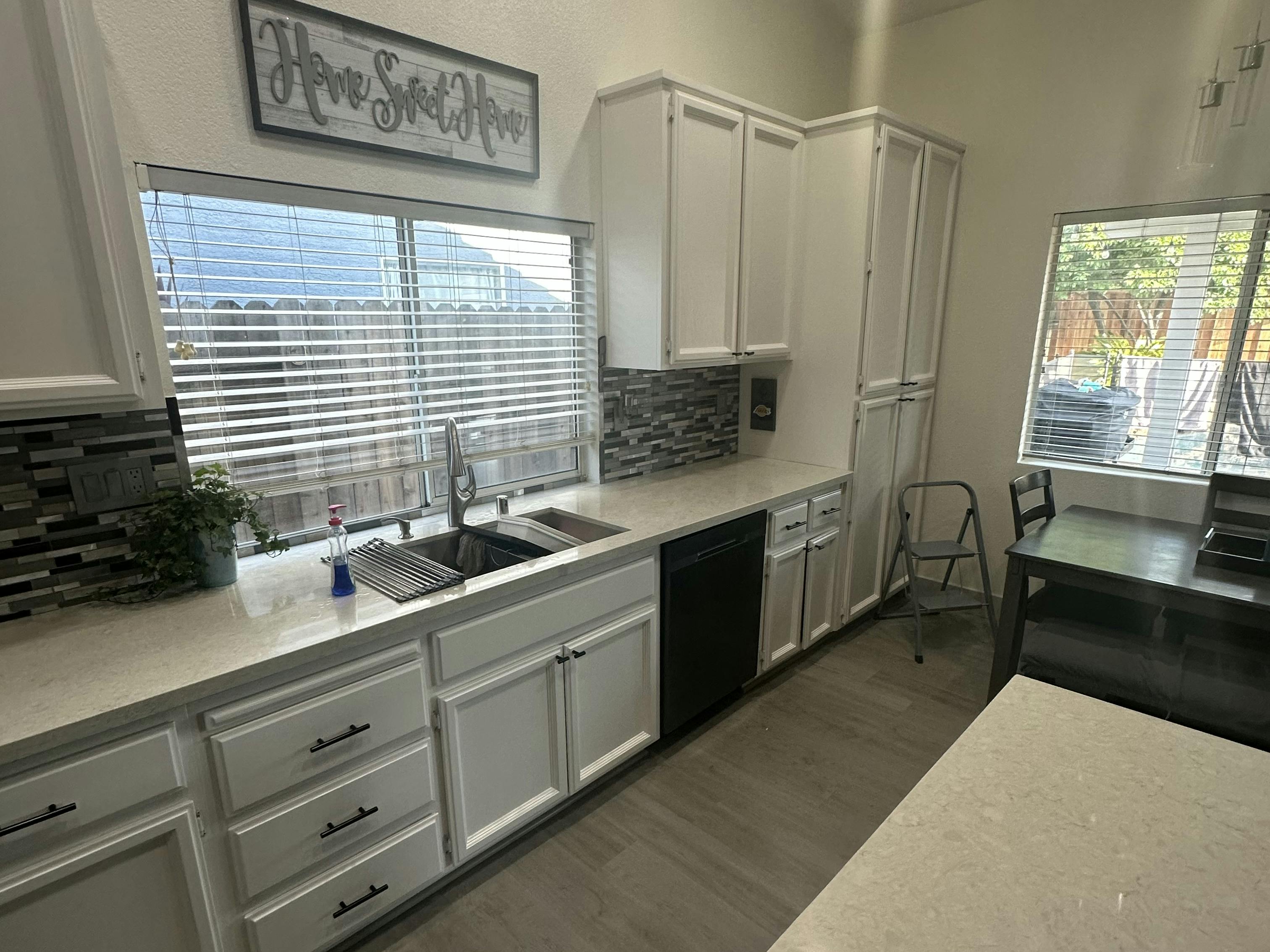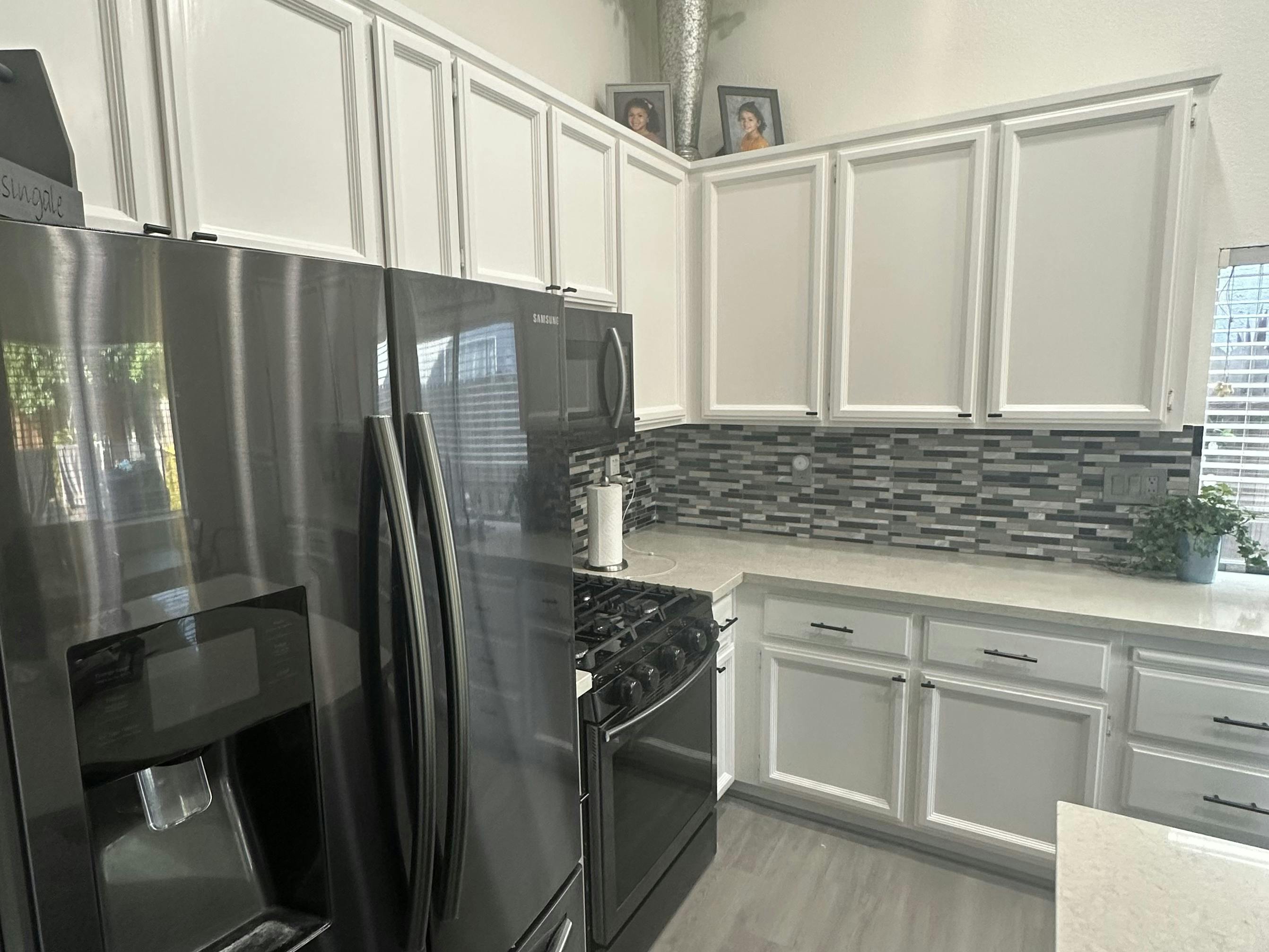 Our company, Essential Cabinet Painting, recently worked on a kitchen in Elk Grove, California. The kitchen had old oak cabinets, and they wanted a change to their dated cabinets. We painted them with KCMA approved "Swiss Coffee" by Kelly Moore.
